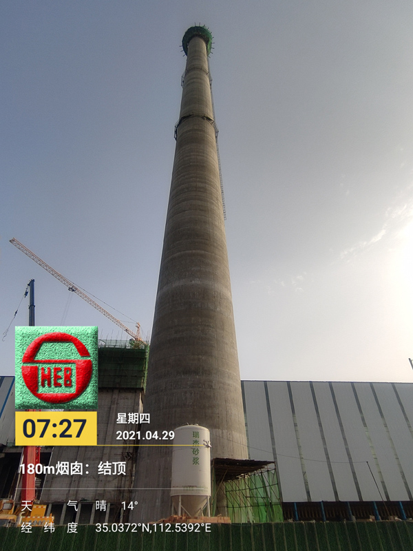 4月29日,六分公司河南金马项目部完成了关键施工节点——180m烟囱土建工程顺利结顶,刷新了河南省济源市最高建(构)筑物纪录。
